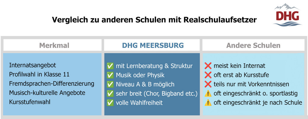 Der Realschulaufsetzer am Droste-Hülshoff-Gymnasium Meersburg ist für Absolventinnen und Absolventen der Realschule, Gemeinschaftsschule, Werkrealschule sowie Waldorfschule mit der mittleren Reife besonders attraktiv durch seine individuelle Förderung, vielfältige Profilwahl und die Möglichkeit, in drei Jahren die allgemeine Hochschulreife zu erlangen.