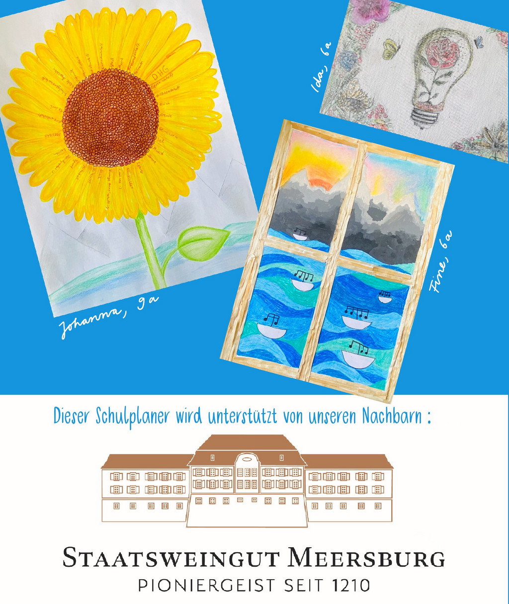 Auch die vier schönsten Werke unseres Schülermalwettbewerbs wurden ausgewählt und zieren den Kalender. Eine Einsicht in die verschiedenen Seiten findest du auf der Pinnwand des gelben Gebäudes. Der Planer kostet 7€ und kann diese Woche über die Klassenlehrer*innen bestellt werden.