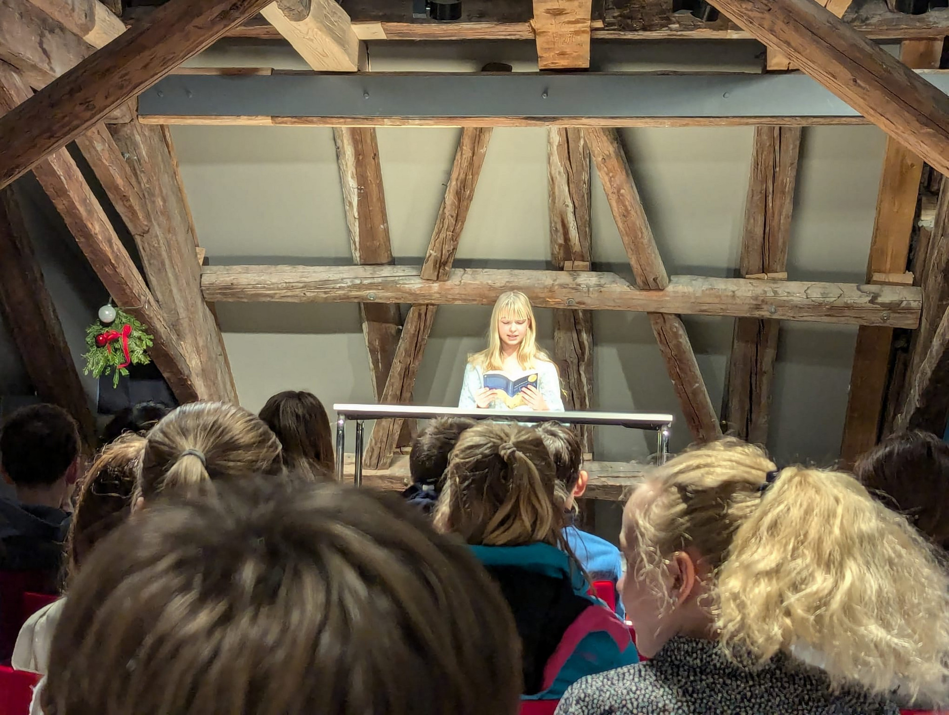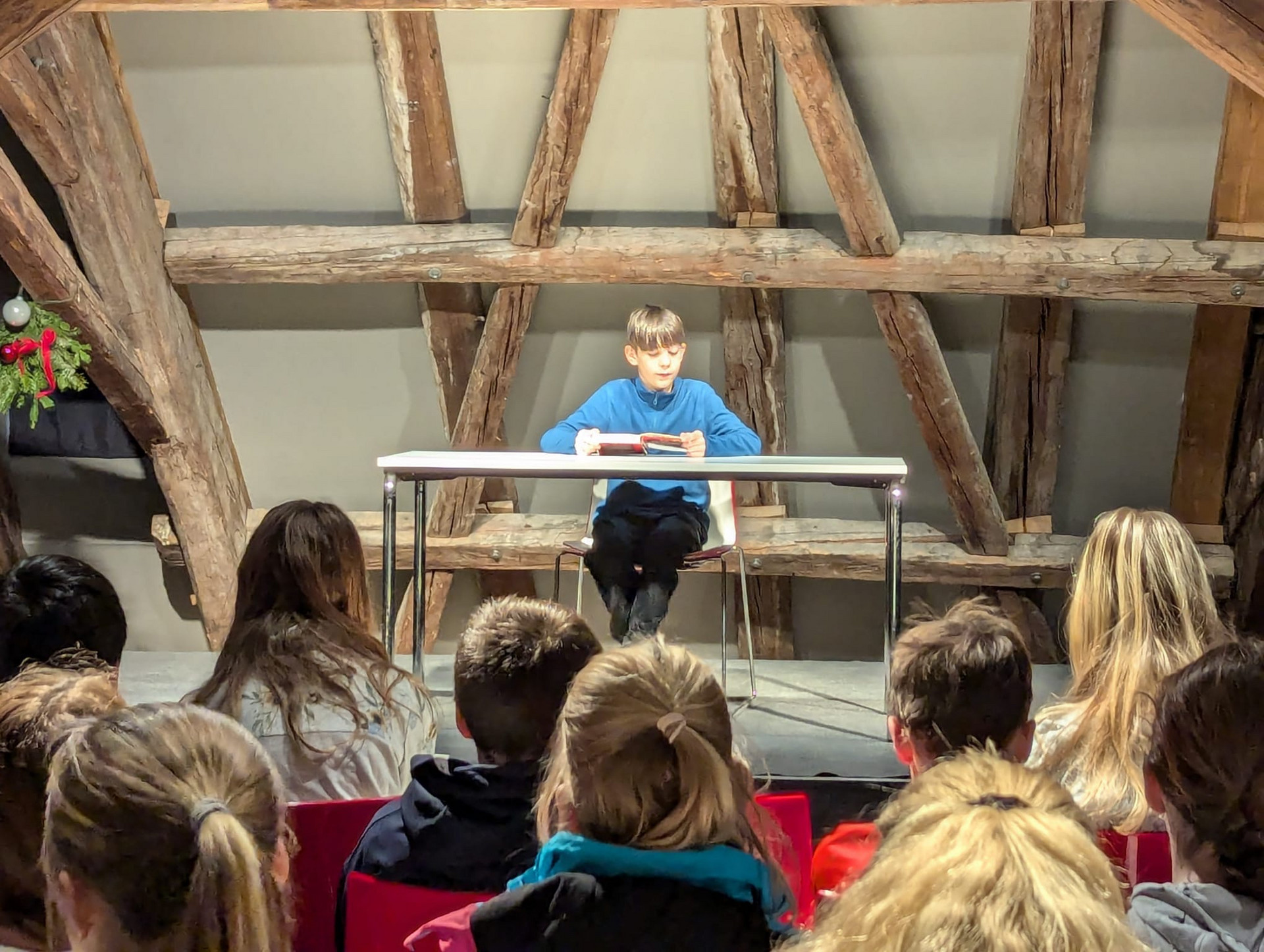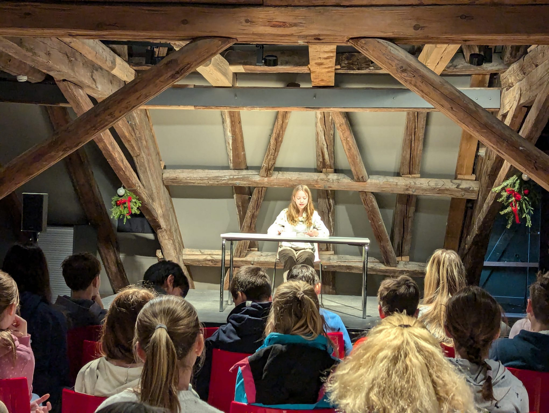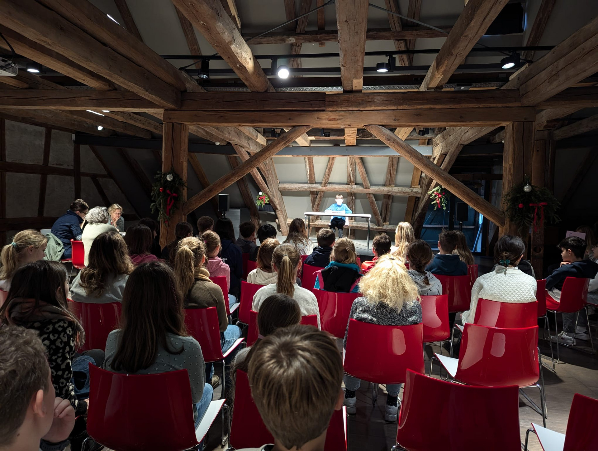 Der Lesewettbewerb der Klasse 6a und 6b ging im wunderschönen Saal des Vineums in die Endrunde. Die zuvor ermittelten vier Klassensieger*innen Maya Häring, Madita Opitz, Emil Eiser und Emma Pfeil traten hier nochmals an, um festzustellen, wer das DHG im Kreisausscheid vertreten darf.