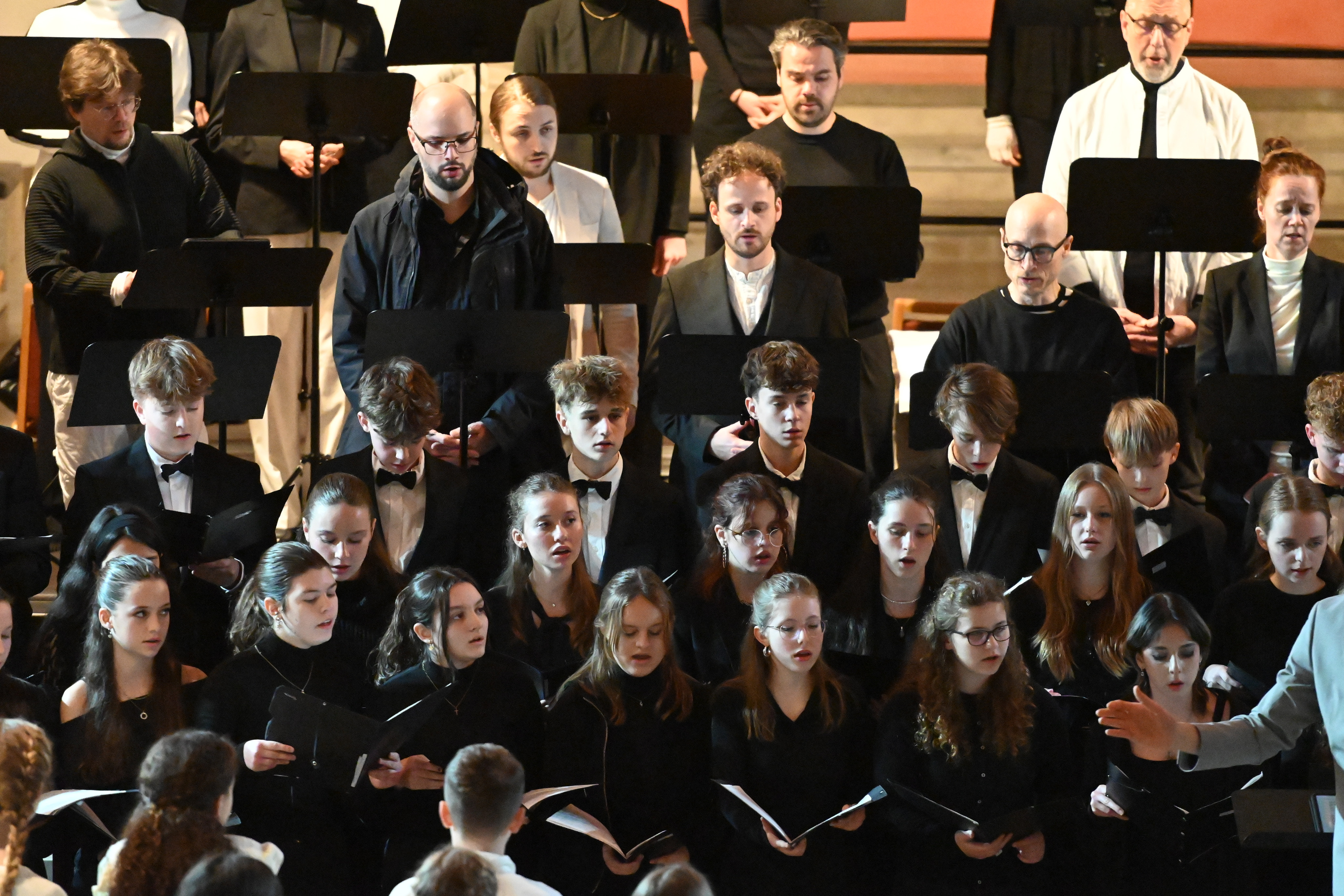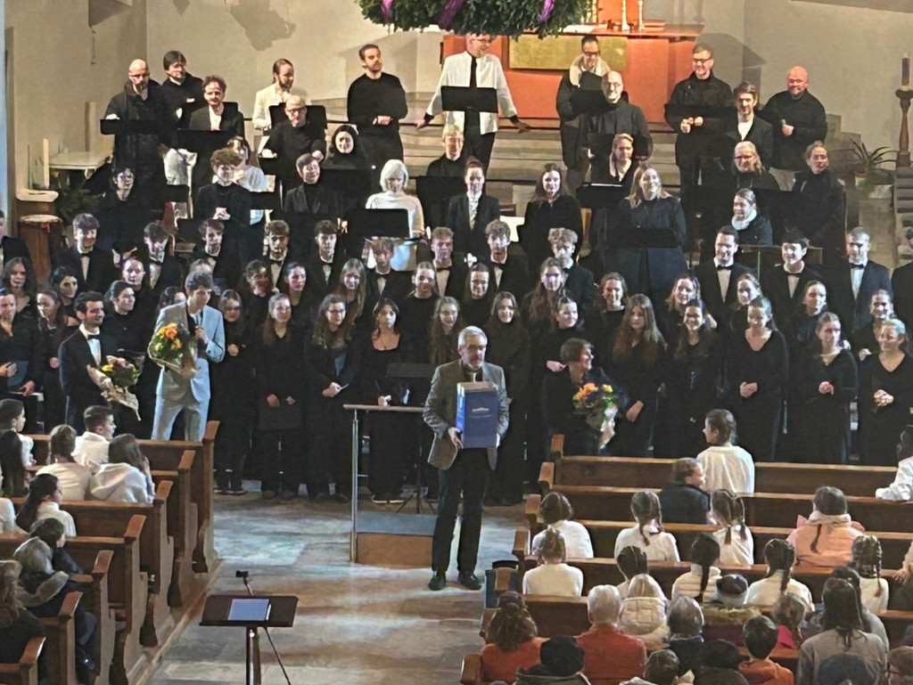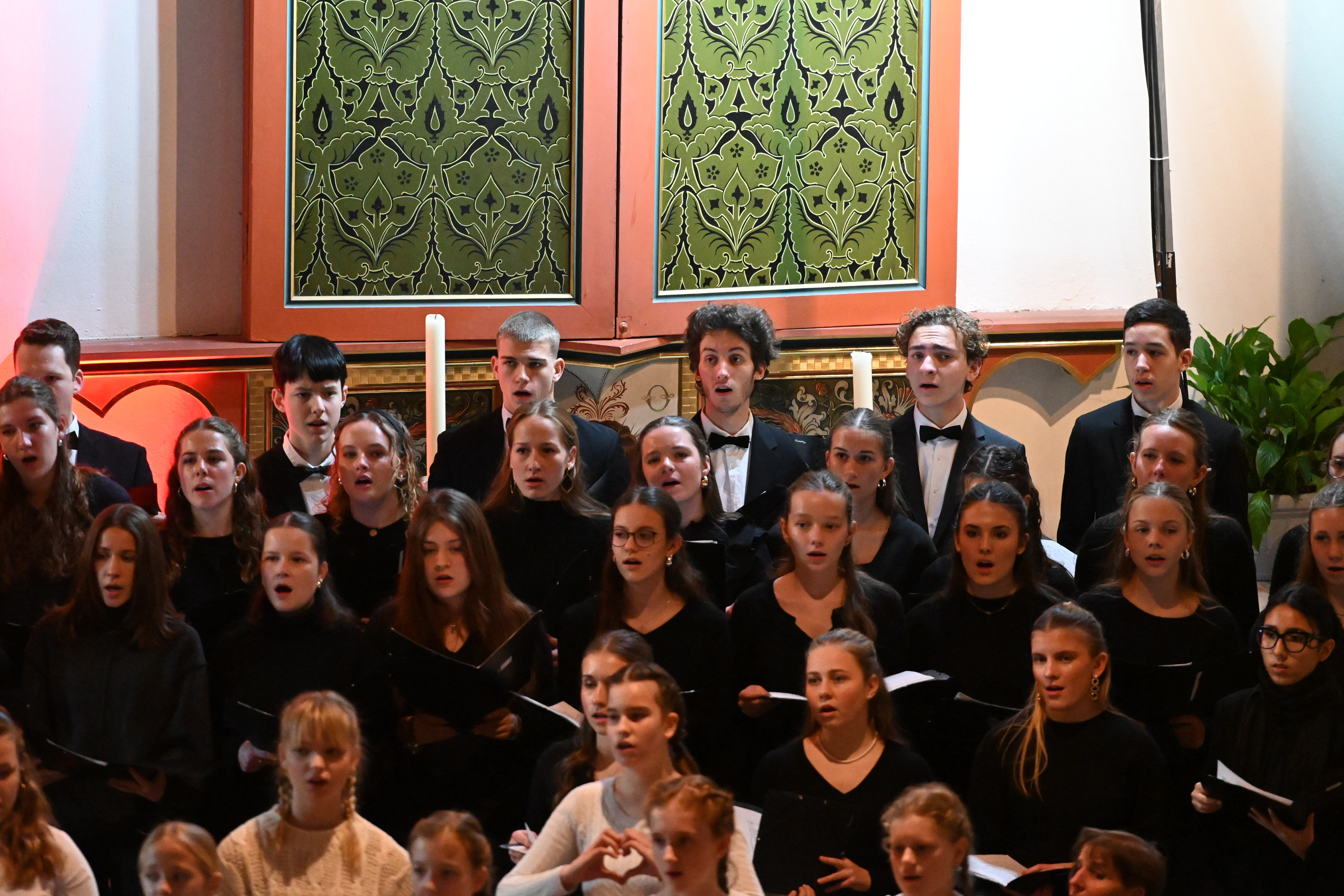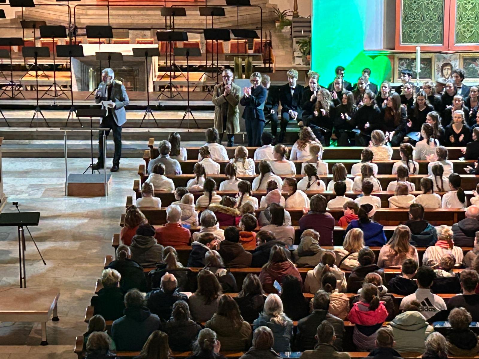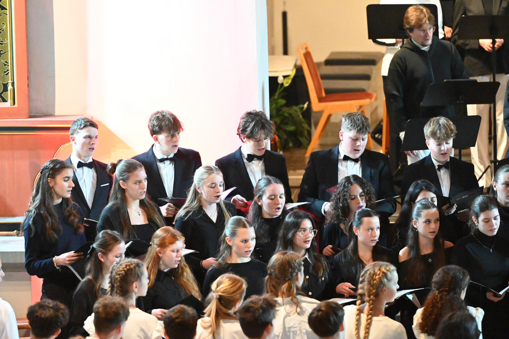 Dazwischen variierten das Vokalensembles und die Chöre in unterschiedlicher Besetzung mit ihren herrlichen Stimmen und einer Klangvielfalt, die keiner weiteren Instrumente bedurfte. Zu hören waren zeitgenössische Kompositionen mit besonderen Klangeffekten, aber auch ein doppelchöriger Satz von Praetorius, den das Vokalensemble mit dem Oberstufenchor gekonnt musizierte. Ein exquisiter musikalischer Hochgenuss, der vom Publikum mit frenetischem Applaus und standing ovations belohnt wurde. Wie Dirigent Yuval Weinberg betonte, sei es eine Besonderheit, dass so viele Jugendliche in einem Schulchor auf so einem Niveau sängen und zeugte Chorleiterin Enikö Driller und Chorleiter Yannik Weese seinen Respekt.