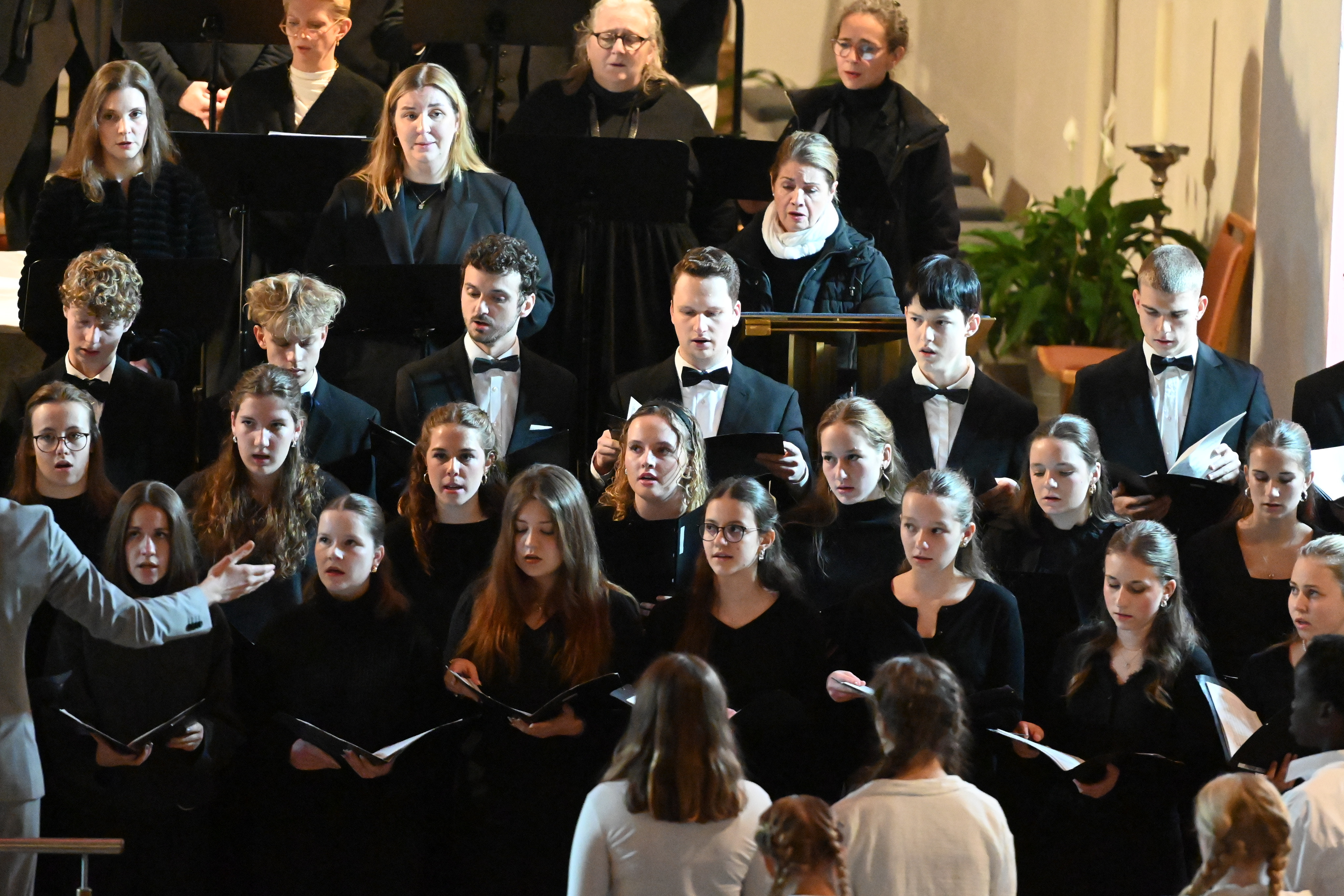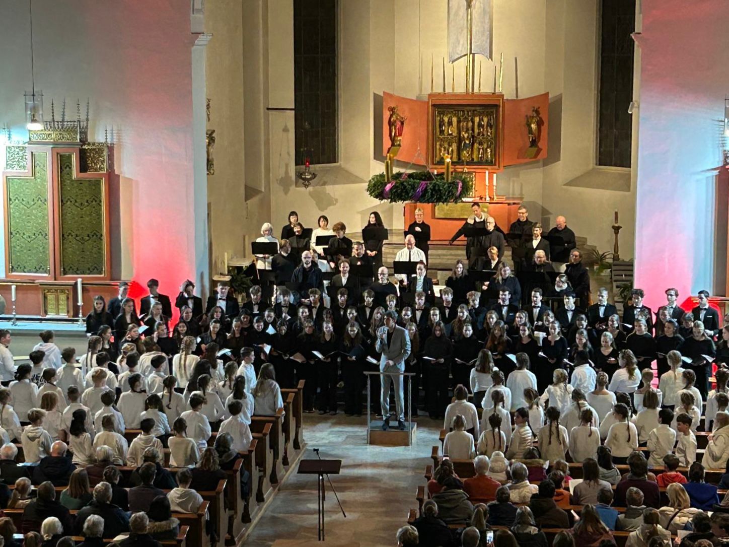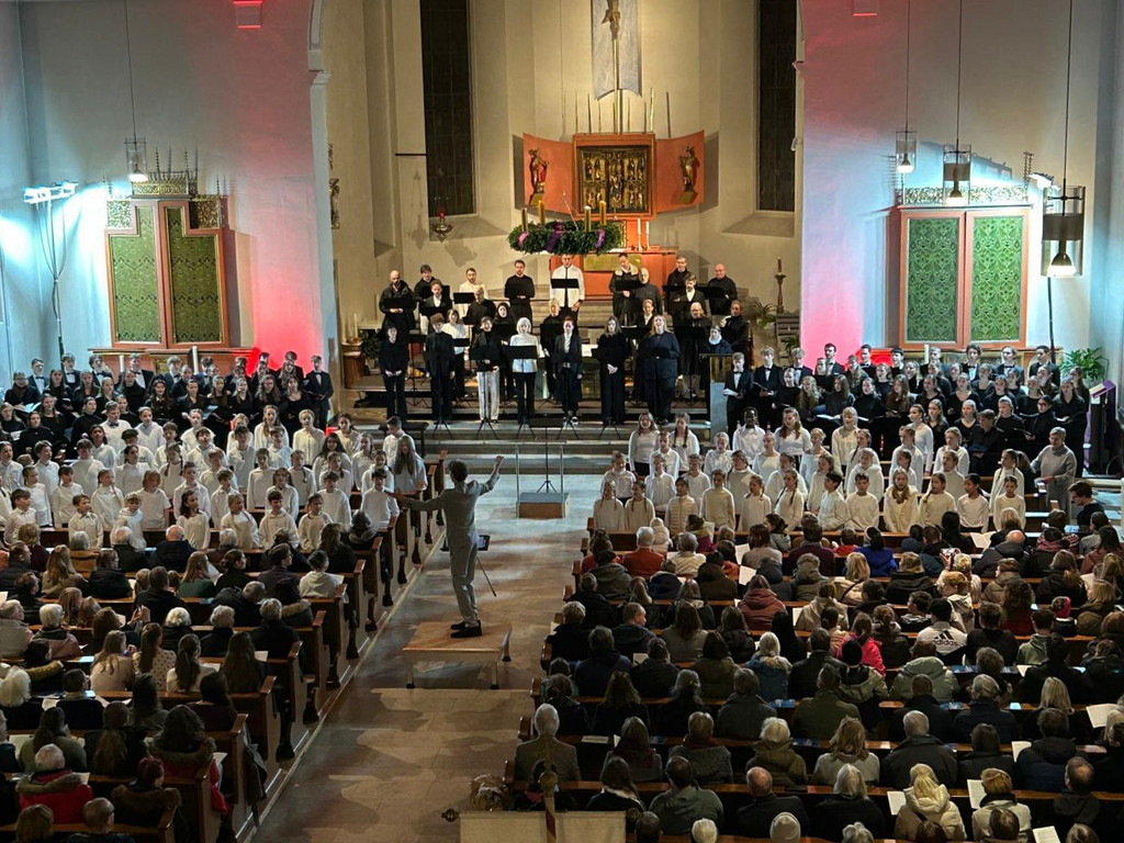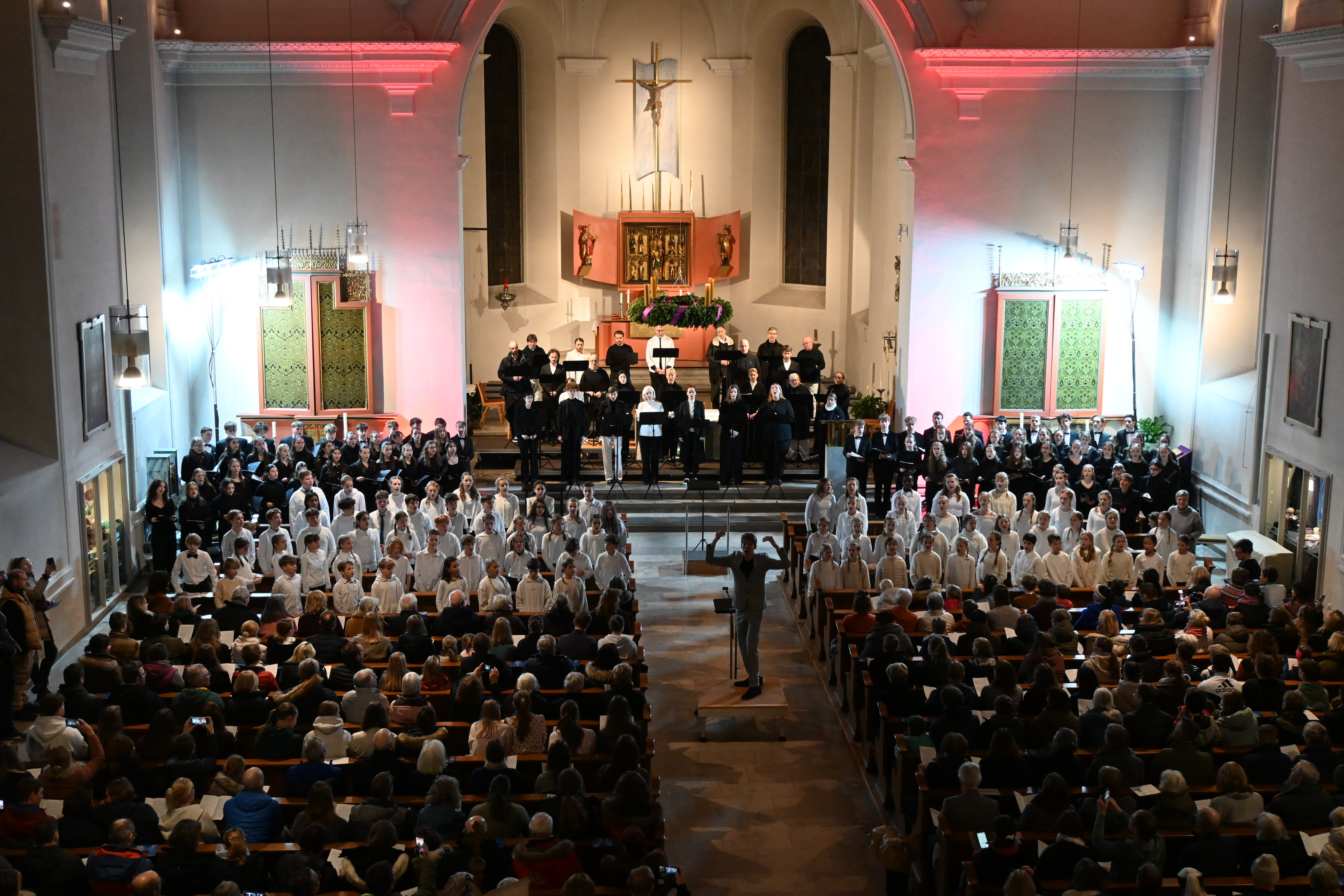 Dazwischen variierten das Vokalensembles und die Chöre in unterschiedlicher Besetzung mit ihren herrlichen Stimmen und einer Klangvielfalt, die keiner weiteren Instrumente bedurfte. Zu hören waren zeitgenössische Kompositionen mit besonderen Klangeffekten, aber auch ein doppelchöriger Satz von Praetorius, den das Vokalensemble mit dem Oberstufenchor gekonnt musizierte. Ein exquisiter musikalischer Hochgenuss, der vom Publikum mit frenetischem Applaus und standing ovations belohnt wurde. Wie Dirigent Yuval Weinberg betonte, sei es eine Besonderheit, dass so viele Jugendliche in einem Schulchor auf so einem Niveau sängen und zeugte Chorleiterin Enikö Driller und Chorleiter Yannik Weese seinen Respekt.