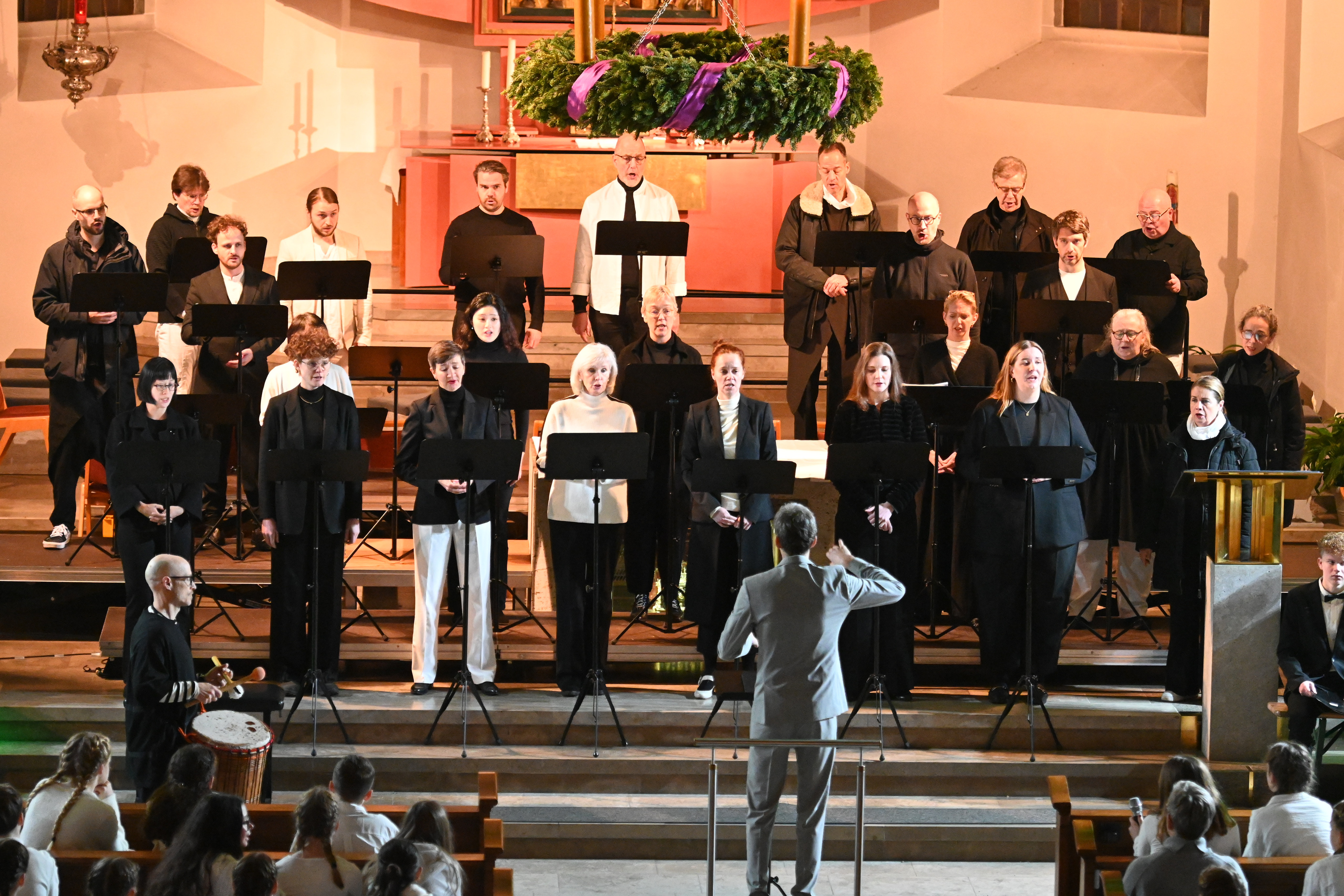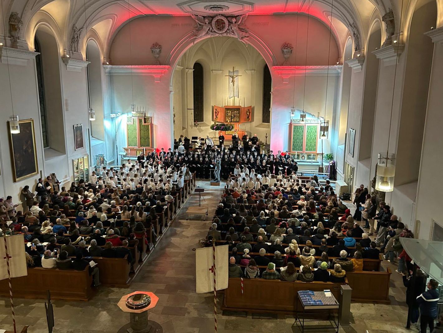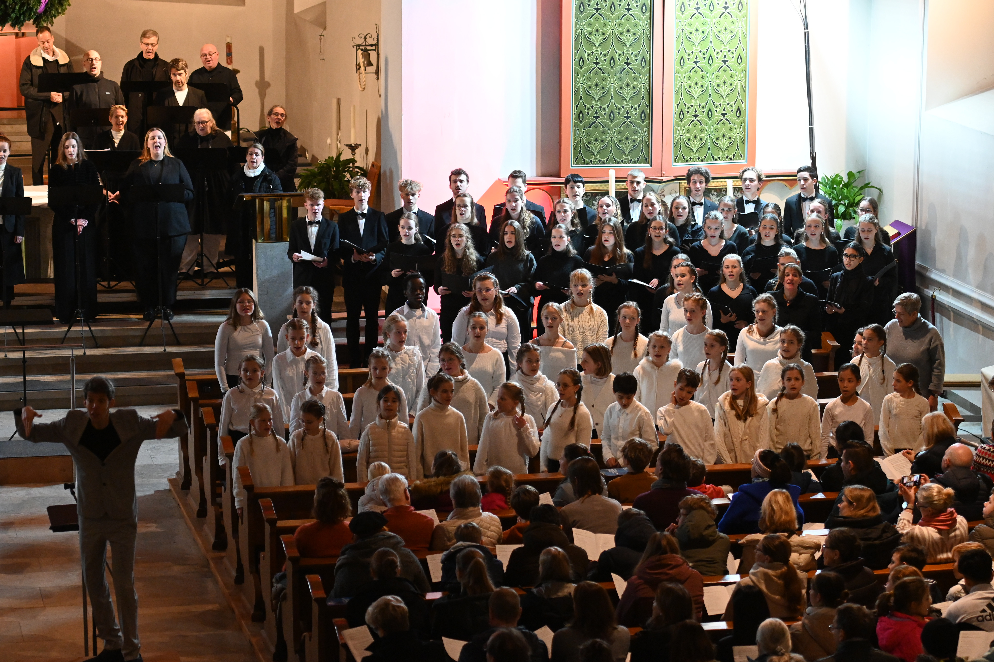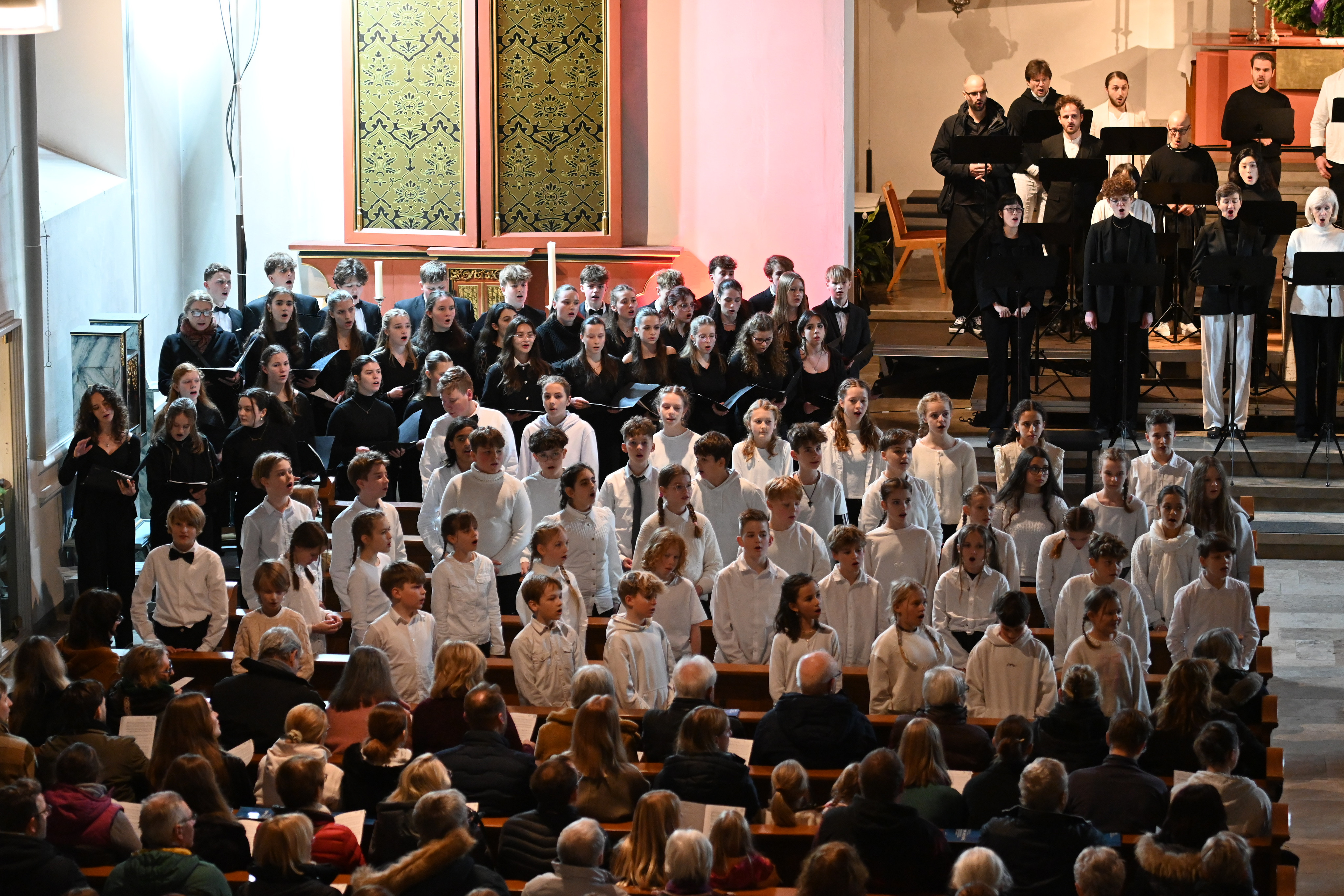 Dazwischen variierten das Vokalensembles und die Chöre in unterschiedlicher Besetzung mit ihren herrlichen Stimmen und einer Klangvielfalt, die keiner weiteren Instrumente bedurfte. Zu hören waren zeitgenössische Kompositionen mit besonderen Klangeffekten, aber auch ein doppelchöriger Satz von Praetorius, den das Vokalensemble mit dem Oberstufenchor gekonnt musizierte. Ein exquisiter musikalischer Hochgenuss, der vom Publikum mit frenetischem Applaus und standing ovations belohnt wurde. Wie Dirigent Yuval Weinberg betonte, sei es eine Besonderheit, dass so viele Jugendliche in einem Schulchor auf so einem Niveau sängen und zeugte Chorleiterin Enikö Driller und Chorleiter Yannik Weese seinen Respekt.