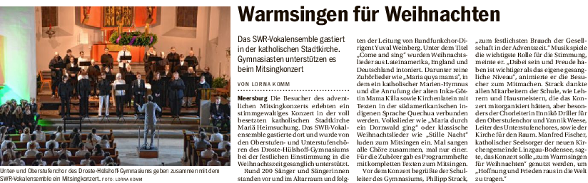 das bewies das Vokalensembles des SWR und die Chöre des DHG mit Weihnachtsliedern aus Lateinamerika, England und Deutschland. Strahlende Gesichter bei Groß und Klein – es war wunderschön, durch Musik berührt zu werden und Gemeinschaft zu erleben. Neben ganz klassischen Liedern wie „Maria durch ein Dornwald ging“, „In dulci jubilo“ bis hin zu „Stille Nacht“ hatte das Publikum auch die Gelegenheit bei Weihnachtsweisen anderer Länder mitzusingen.